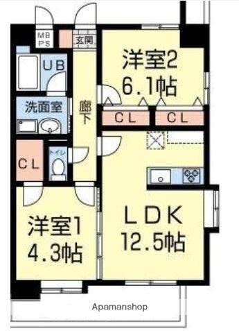 | 間取り詳細 | 洋室(6.1帖)、洋室(4.3帖)、LDK(12.5帖) | ||