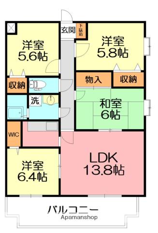 | 間取り詳細 | 洋室(6.4帖)、洋室(5.8帖)、洋室(5.6帖)、LDK(13.8帖) | ||