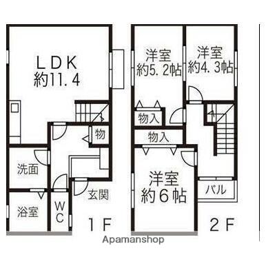 | 間取り詳細 | LDK(11.4帖)、洋室(6帖)、洋室(5.2帖)、洋室(4.3帖) | ||