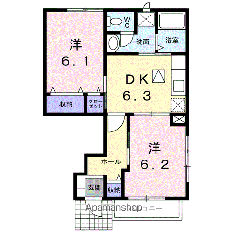 | 設備 | バス・トイレ別、バルコニー、フローリング、床下収納、BSアンテナ、シャワー、洗濯機:室内 | ||