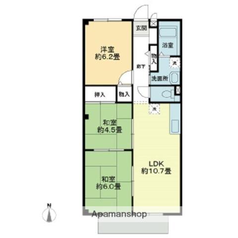 | 間取り詳細 | LDK(10.7帖)、和室(6帖)、和室(4.5帖)、洋室(6.2帖) | ||