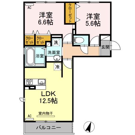 | 間取り詳細 | 洋室(5.6帖)、洋室(6.6帖)、LDK(12.5帖) | ||