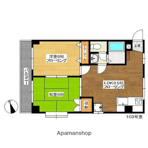 | 間取り詳細 | 洋室(6帖)、和室(6帖)、DK(9.5帖) | ||