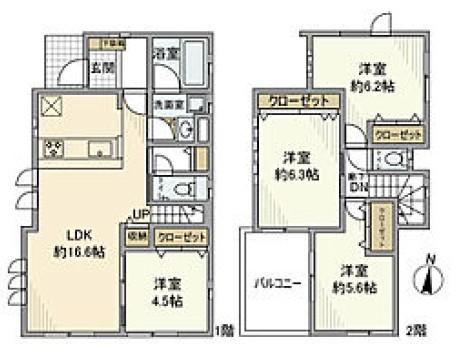 | 間取り詳細 | LDK(16.6帖)、洋室(4.5帖)、洋室(5.6帖)、洋室(6.2帖)、洋室(6.3帖) | ||