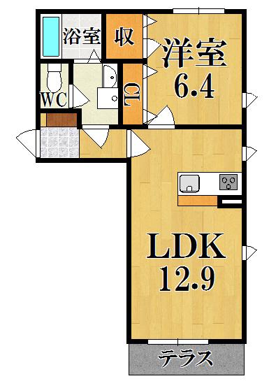 | 間取り詳細 | LDK(12.9帖)、洋室(6.4帖) | ||
