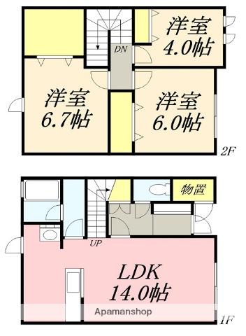| 間取り詳細 | LDK(14帖)、洋室(6.7帖)、洋室(6帖)、洋室(4帖) | ||