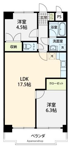 | 間取り詳細 | LDK(17.5帖)、洋室(4.5帖)、洋室(6.3帖) | ||