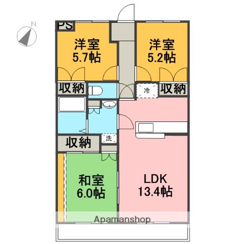 | 間取り詳細 | LDK(13.4帖)、和室(6帖)、洋室(5.7帖)、洋室(5.2帖) | ||