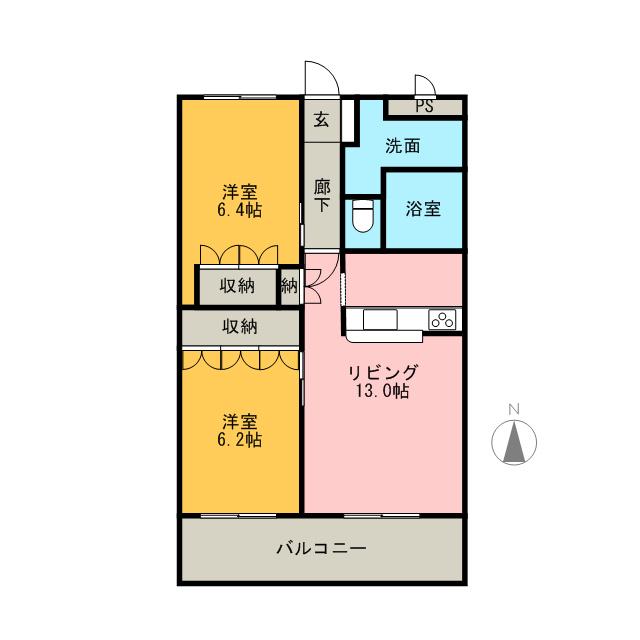 | 間取り詳細 | LDK(13帖)、洋室(6.2帖)、洋室(6.4帖) | ||