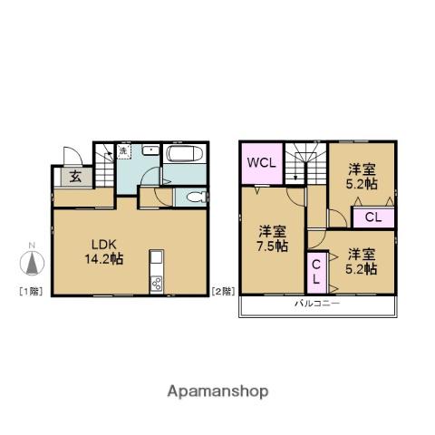 | 間取り詳細 | LDK(14.2帖)、洋室(7.5帖)、洋室(5.2帖)、洋室(5.2帖) | ||